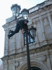 La Galería Pepe Cobo cuenta con las instalaciones de MP&MP Rosado, dos hermanos andaluces cuyas esculturas aparecen colgadas o bien aplastadas por un suelo o pared que se les ha venido encima sin poder evitarlo. Esta dura noticia, difícil de digerir, no deja de estar representada con cierta ironía. En algún momento las imágenes transmiten una sensación de risa más que de tristeza por la desgracia ocurrida. Es mas, me atrevería a decir que sus figuras parecen protegidas del sol por una pared y que descansan cubriéndose del calor andaluz y durmiendo una plácida siesta. Sin duda unas instalaciones muy llamativas.