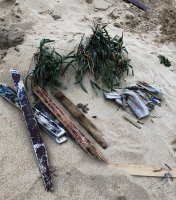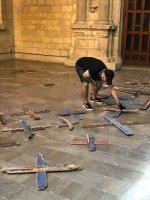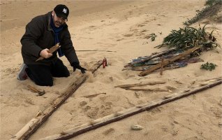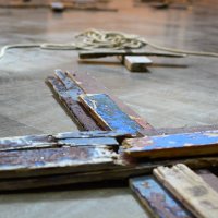 Durante los meses de noviembre y diciembre el artista fue recogiendo restos de pateras naufragadas en esa playa. Reuniendo gran cantidad de maderas rotas, de colores vivos, desgastadas por el mar. Un material cargado de energía, con una historia muy dura detrás, por lo que intentó tratarlo con el máximo respeto:“las maderas aparecieron solas, estaban ahí y sentí la necesidad de utilizarlas para contar su historia”, y comenzó a elaborar las cruces que componen esta instalación.