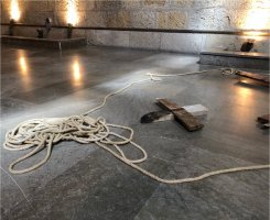 Hope and Pain tiene forma de calvario, martirio y muerte. “La cruz me acompaña desde hace más de una década. Es un símbolo muy potente y rico, que repito constantemente. En concreto estas cruces, en forma de aspa o cruz de san Andrés, se han convertido en un elemento característico en mi trabajo. Las cruces, los sacos y las cuerdas son mis señas de identidad”, manifiesta Montijano. “La cruz me interesa como elemento espiritual o religioso, como marca que señala al que intenta evolucionar, el que vuelve la mirada a su interior; y como instrumento de martirio, yo busco ese sacrificio de la carne, de lo material. En este caso, empleo la cruz en forma de X, tal vez más neutra que la latina, pero que igualmente indica ese martirio o sacrificio”.