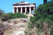 Una vez que salimos de la Acrópolis, parece que a estos miles de turistas se los traga la tierra, lo cual es una ventaja para visitar el resto de áreas arqueológicas de la ciudad. A los pies de la colina encontramos los dos principales conjuntos de la ciudad: el ágora clásica y el foro romano. El acceso a ambos conjuntos se realiza con la misma entrada de la Acrópolis, que además incluye otras áreas como el templo de Zeus, que luego veremos. El ágora ateniense tiene varios puntos fuertes para el visitante, aunque lo más normal es que el turista poco avisado sólo pueda disfrutar de un catálogo inacabable de malas hierbas de más de medio metro de altura. Sin embargo, debemos destacar algunos puntos para su visita. Empezaremos por el templo de Hefesto, edificio magistralmente conservado (si no tenemos en cuenta las ayudas contemporáneas) y que da al visitante una visión casi completa de la estructura de un templo en la antigüedad clásica. Descendiendo aún más pasamos por el ágora y el teatro, hasta llegar a la Stoa de Atalo, reconstrucción realizada en los años cincuenta por la escuela americana. Este edificio resulta una falsificación y una destrucción del entorno propias de unas ideas sobre restauración hoy totalmente superadas. Sin embargo, es de agradecer la sombra que proporcionan sus pórticos tras unas horas de visita bajo el fuerte sol ateniense.