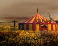 La mujer cubre con su camisón al hombre y su mesa. Una carpa.