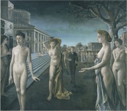 en las ciudades nocturnas de Paul Delvaux, donde uniformados funcionarios